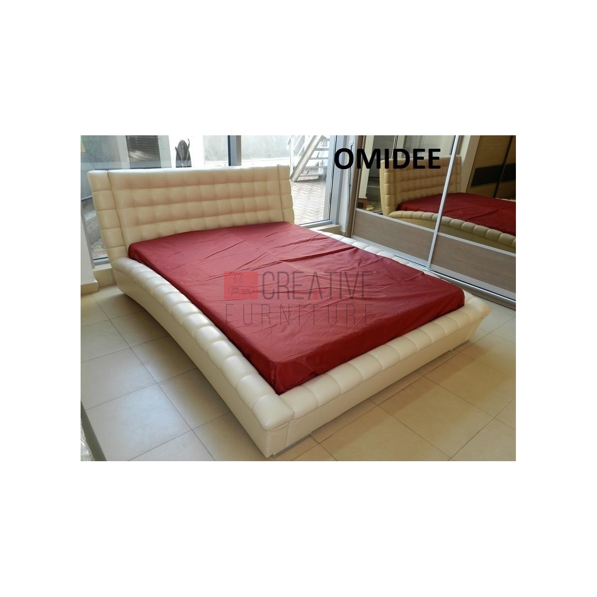 Pat tapitat piele ecologica bej. Patul este cu lada si contine somiera rabatabila