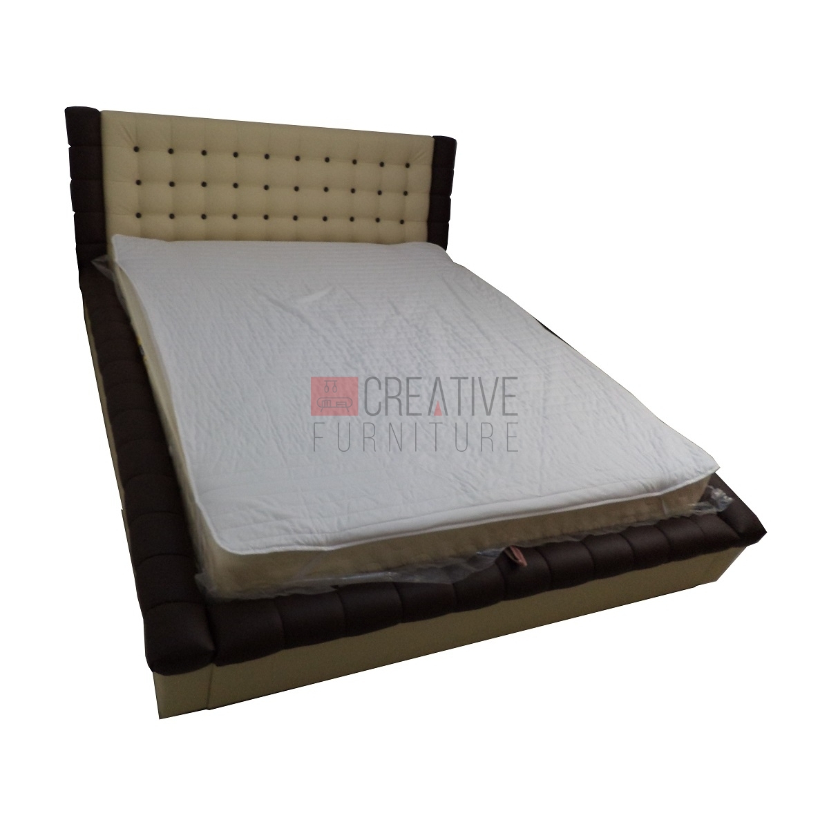 Pat tapitat piele ecologica maro/bej. Patul este cu lada si contine somiera rabatabila
